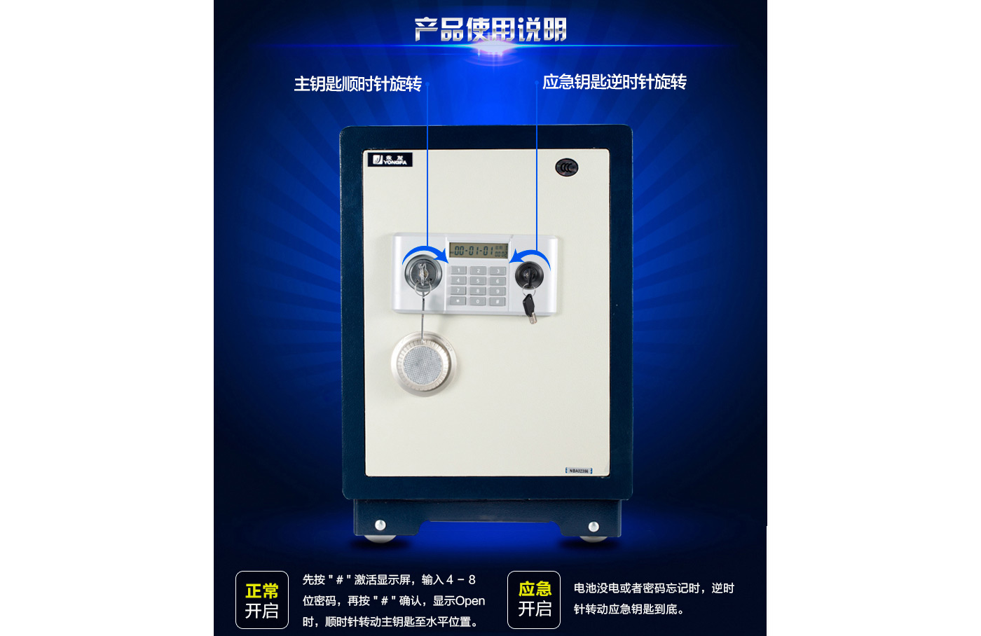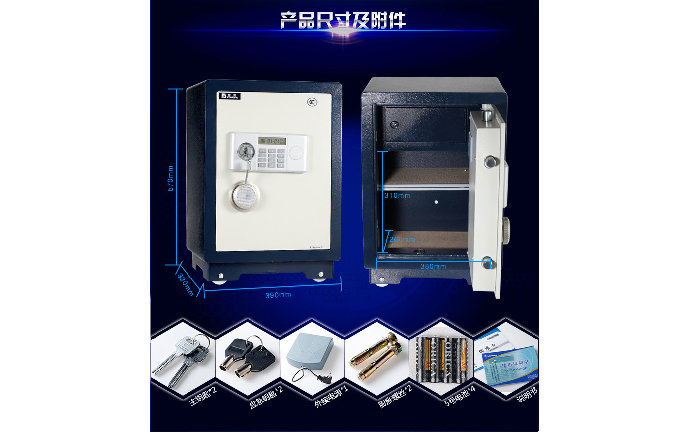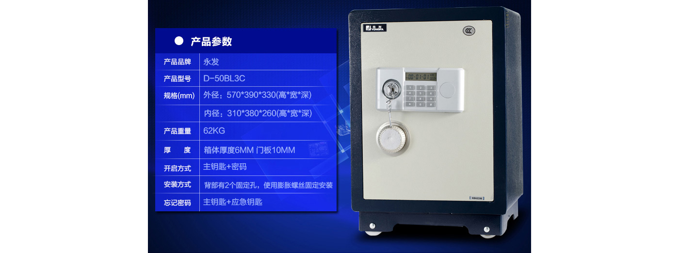 永發(fā)經典電子系列3C認證保險箱D-50BL3C尺寸說明:570高*390寬*330深mm(含底座) 重量:62kg
