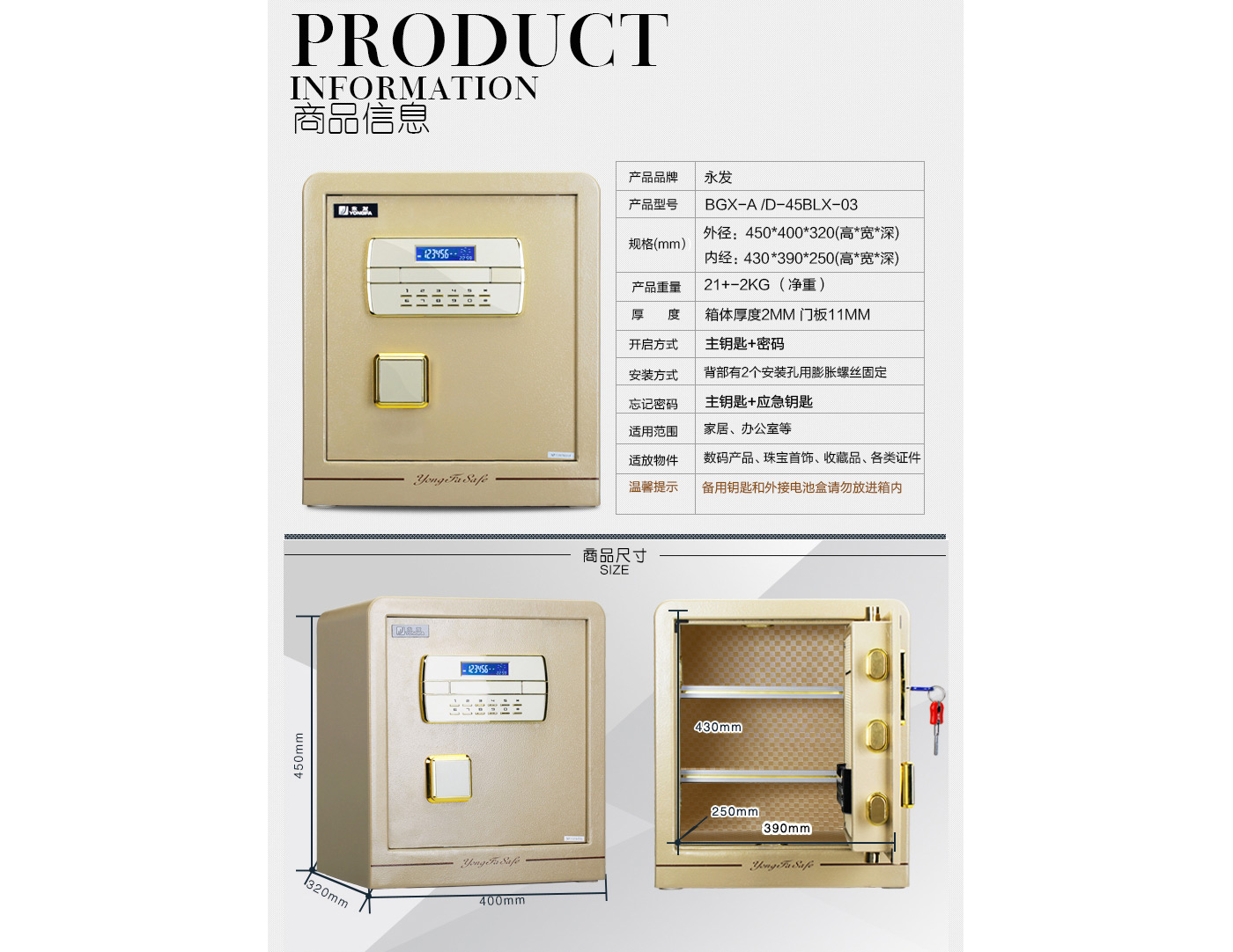 永發(fā)靈寶保管箱D-45BLX-03尺寸說明:450高*400寬*320深mm 重量:21kg