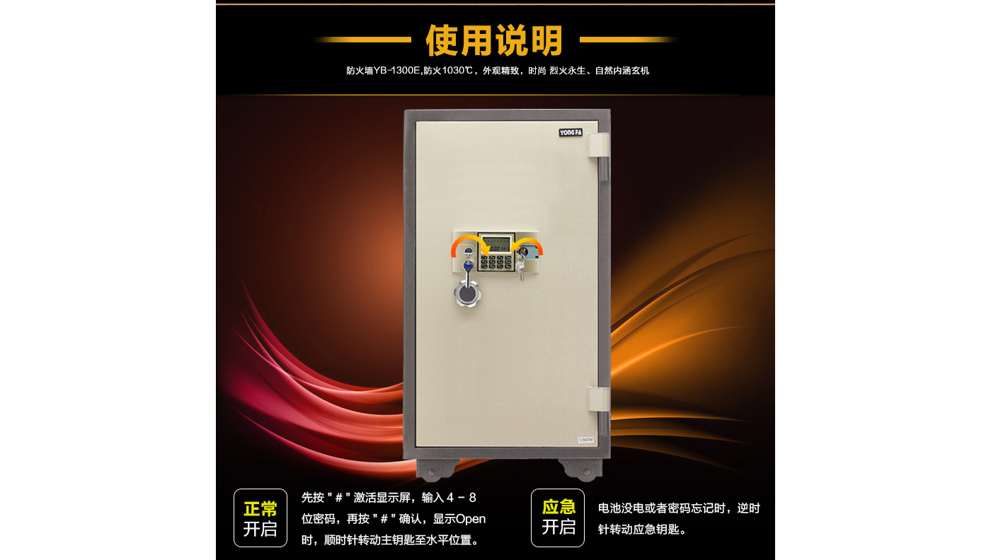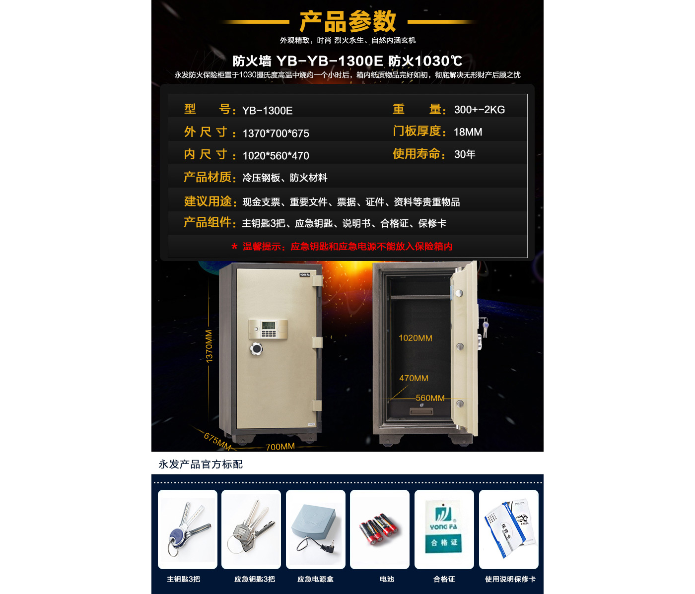 永發(fā)電子防火柜YB-1300E尺寸說(shuō)明:1370高*700寬*675深mm(含底座) 重量:300kg