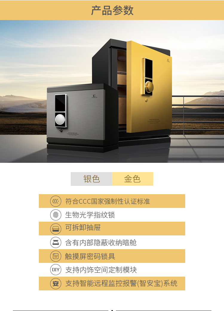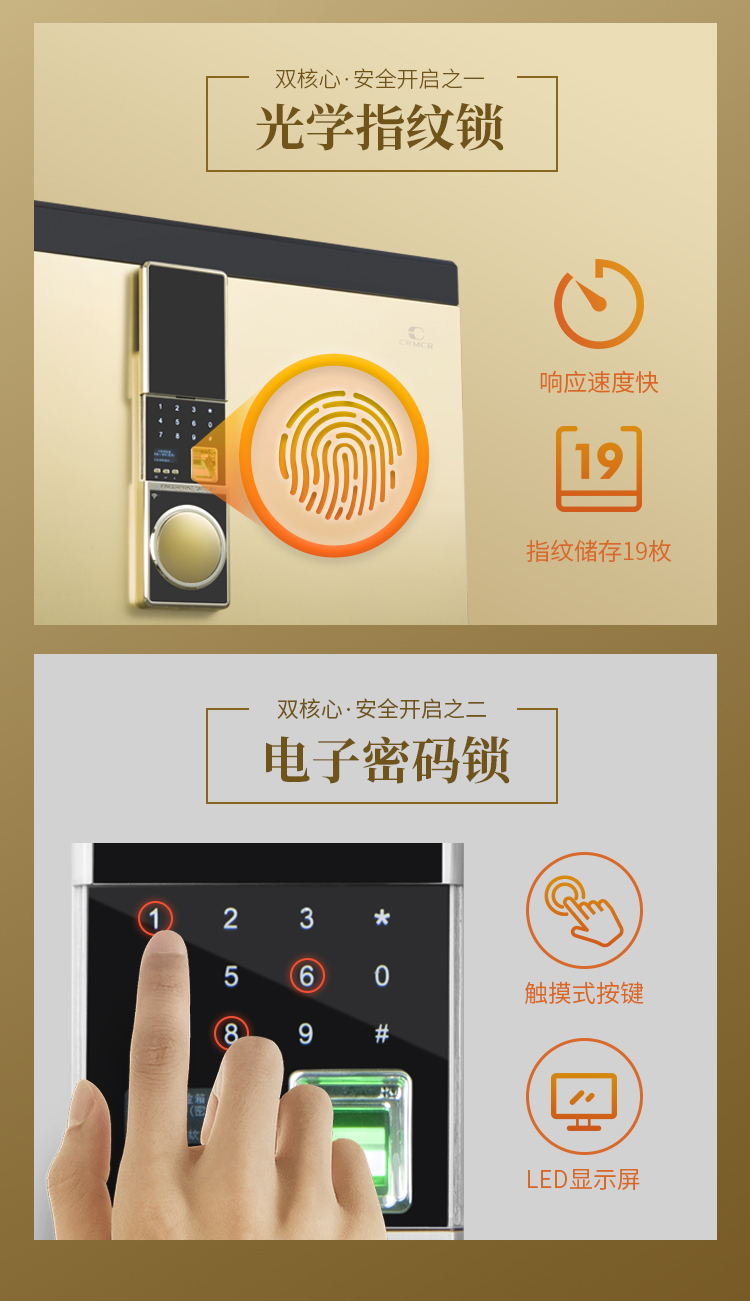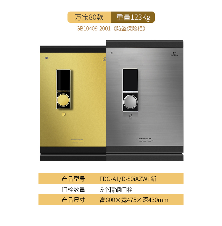 卡嘜萬(wàn)寶指紋+電子密碼系列3C認(rèn)證保險(xiǎn)箱D-80iAZW1尺寸說(shuō)明:850高*475寬*430深mm(含底座) 重量:123kg